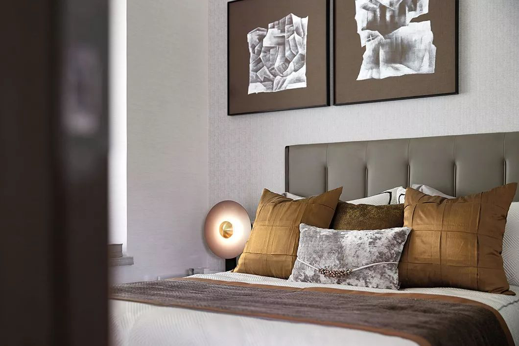 延續空間整體色調,大地棕色,在主臥空間顯得含蓄、靜謐,與窗外景色與之呼應。