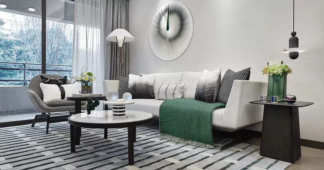 客廳以柔軟舒適的家具線條勾勒空間,干凈利落,黑色大理石茶幾與灰色地毯搭配相得益彰,更加豐富了空間層次。