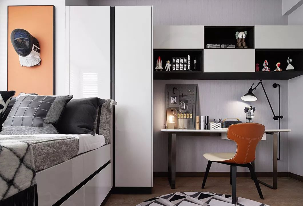 老人房沒有(you)過多的裝飾,以沉穩的灰色為底色,并運用一些原(yuan)色呈現(xian)房間的舒適(shi)度。