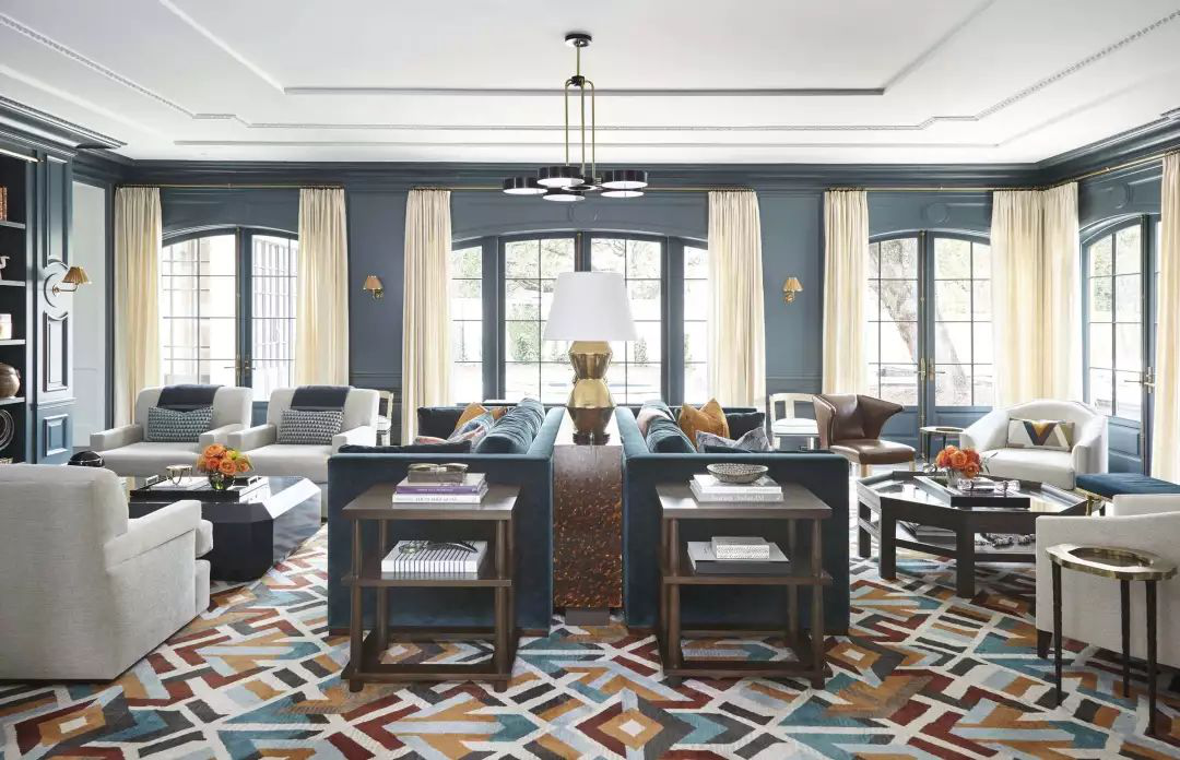 彩色(se)地毯(tan)是房(fang)間的(de)(de)焦點(dian),以此獲得更具凝(ning)聚(ju)力(li)的(de)(de)外(wai)觀。而房(fang)間墻面采用了(le)灰藍色(se),在(zai)它的(de)(de)暈染(ran)之下,整個空(kong)間呈現著(zhu)異想(xiang)天開般的(de)(de)浪漫與優(you)雅。清俊秀(xiu)雅的(de)(de)孔(kong)雀藍作為(wei)過渡裝飾色(se)被使用在(zai)沙發、地毯(tan)、座(zuo)椅(yi)等(deng)布藝上(shang),大(da)面積填(tian)充其(qi)中(zhong),將高雅的(de)(de)韻(yun)味加以強調。杏仁色(se)與磚(zhuan)紅色(se)作為(wei)補充,二者的(de)(de)加入(ru)無疑為(wei)空(kong)間增色(se)不少,強有力(li)的(de)(de)展現著(zhu)悅動的(de)(de)氣質。