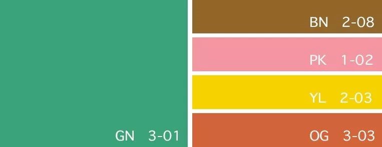 ——明綠色、金棕色、火烈鳥粉、帝國黃、南瓜色——