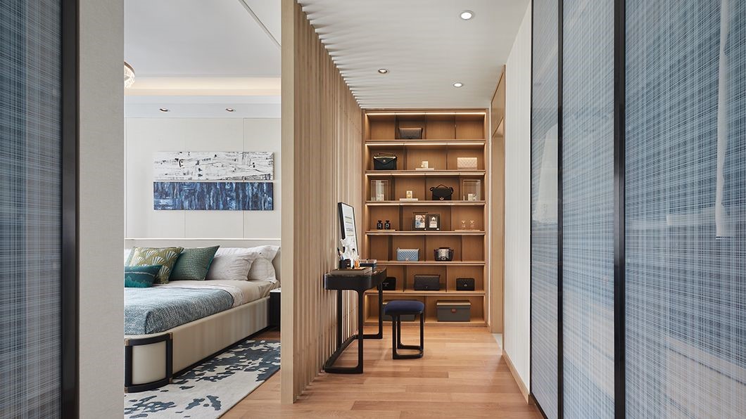 透(tou)過木格(ge)柵(zha),主臥亦可(ke)一窺衣(yi)帽間(jian)的(de)(de)風采。展示性與功能性兼(jian)并的(de)(de)衣(yi)帽間(jian)設立于走廊盡(jin)頭(tou),設計師在不經意的(de)(de)筆觸(chu)中,將低調(diao)奢(she)華的(de)(de)高貴(gui)感勾勒(le)而出。