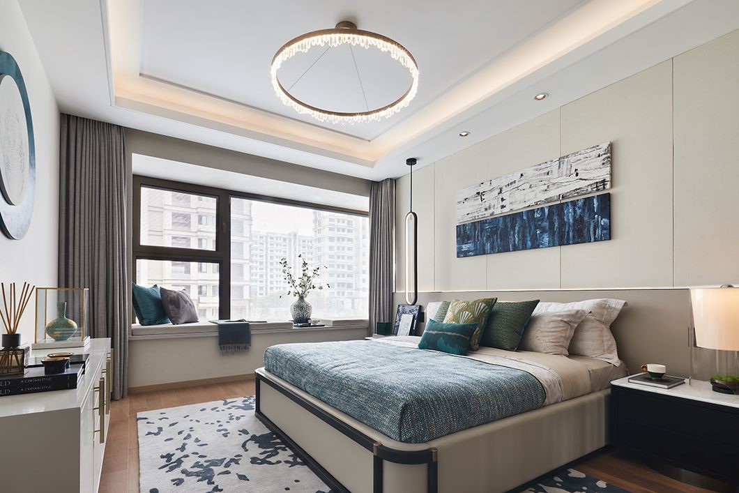 主(zhu)臥床背與床一體化設計,空間關系更加(jia)完整,隱藏(zang)燈帶的設置,運用光與影營(ying)造溫馨與時尚氛圍。