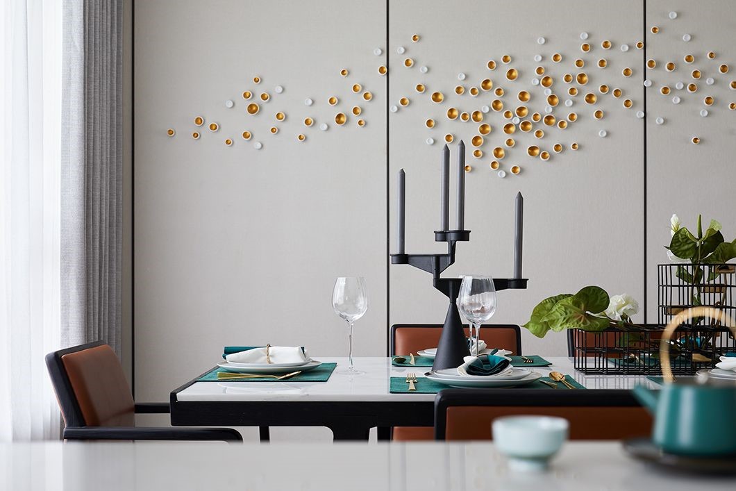 定制的(de)白金手工拉膜(mo)打(da)造墻面藝術裝置(zhi),由點及面,繪制出(chu)起伏形狀,似云似水,通過有機圖案(an)、重復(fu)序列(lie)和反射光創造出(chu)流(liu)動之(zhi)美,同(tong)時也(ye)與客廳的(de)山水藝術畫相(xiang)互(hu)呼應。