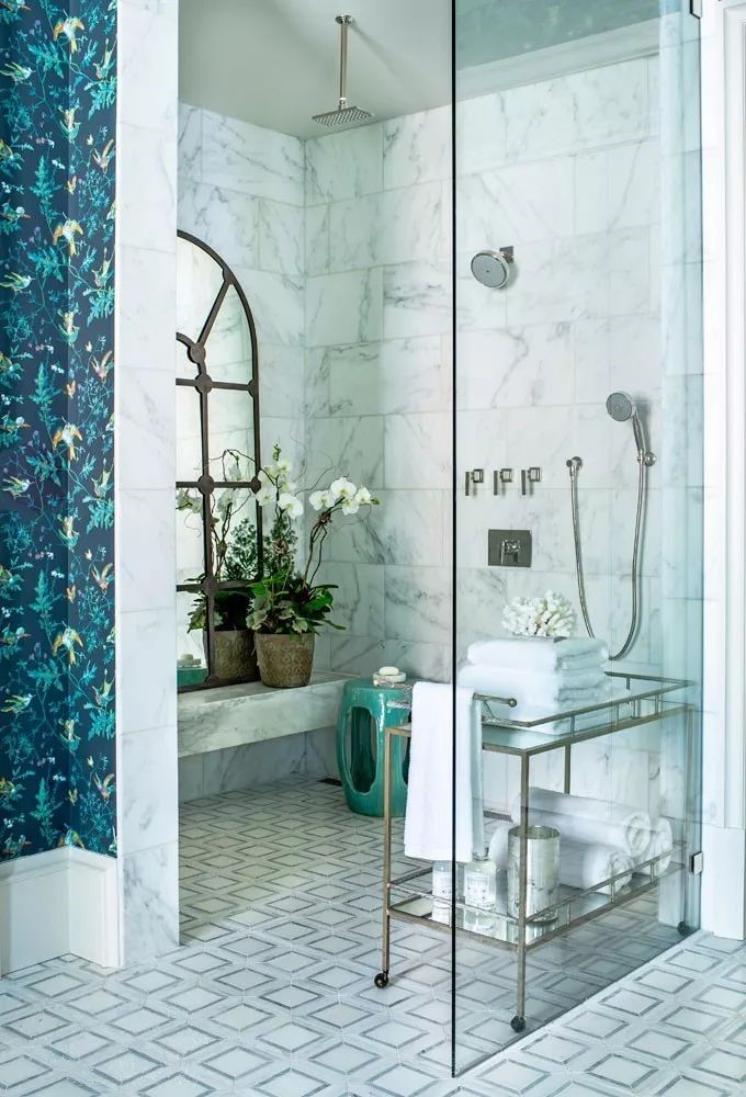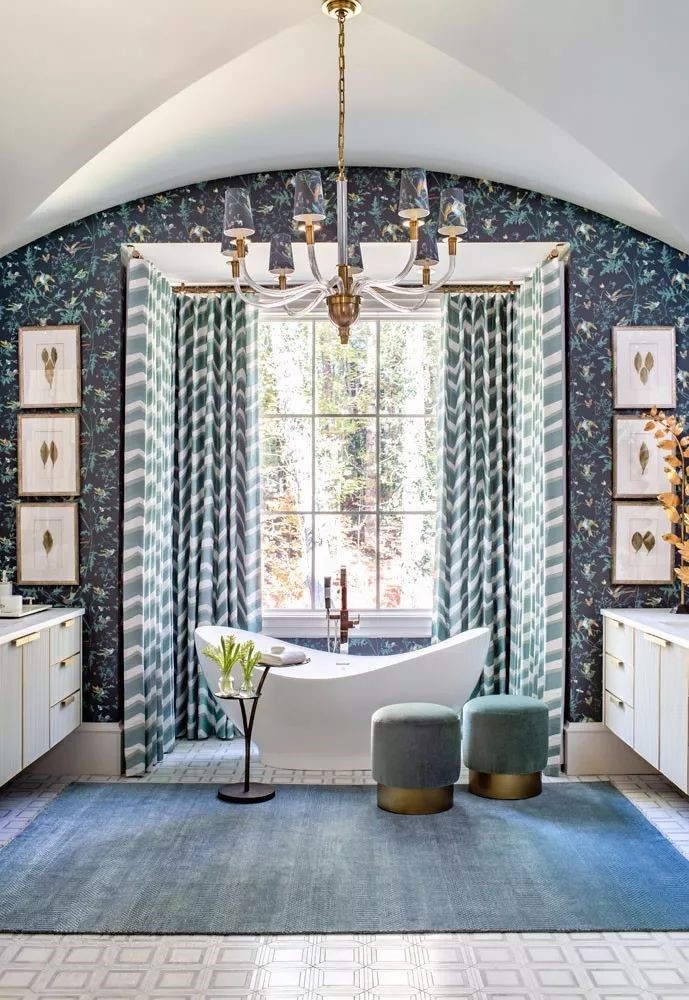 ——設計師被櫥柜蘆葦狀裝飾和黃銅框架吸引,他選擇了上七十年代的蜂鳥壁紙,將空間演變成法國花園主題。墻紙上出現枝形吊燈裝飾,絲形的帷幔為有機的而富有戲劇性的浴室畫上了框架。設計師索西說:“雖然他是老式的,但我們仍然為那些作品帶來了非常現代的尺度。”