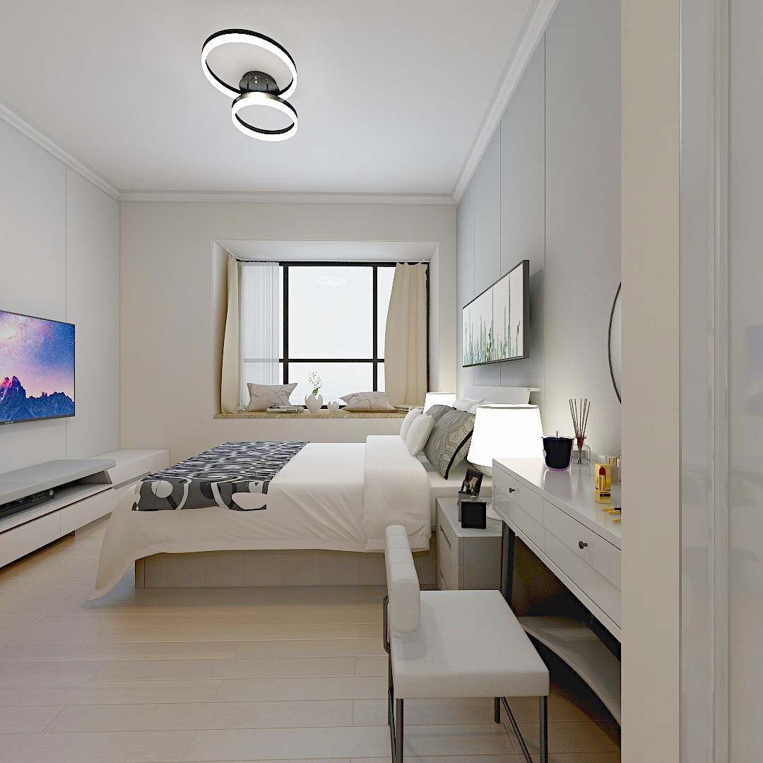 ——臥室講究溫暖舒適,使用了大量的米白色,烘托溫暖的氛圍。梳妝臺方圓結合,現代與時尚感呼之欲出。