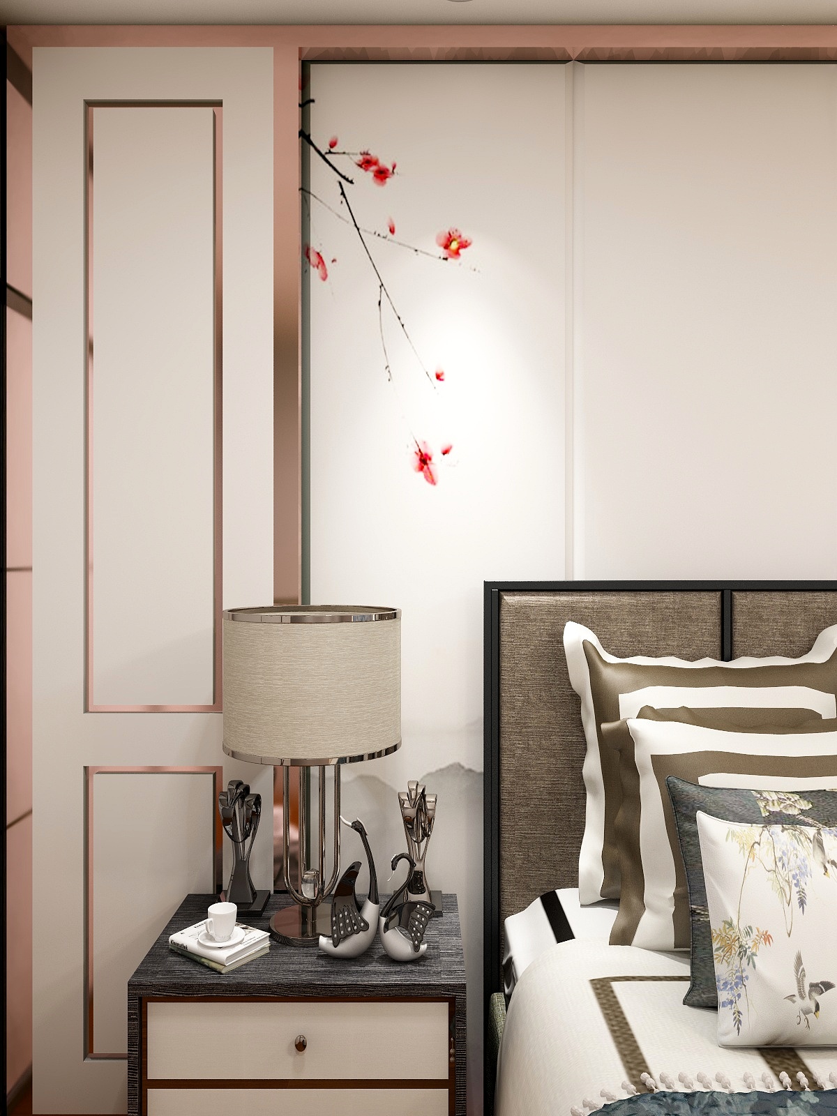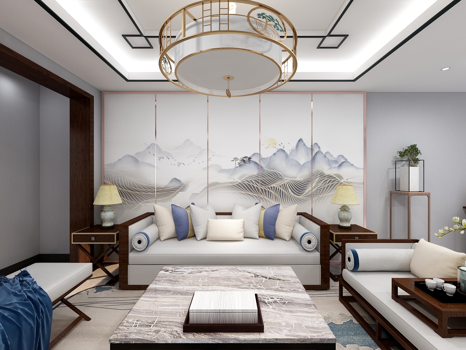 ——本案為(wei)新(xin)中式,不同于中式的(de)裝(zhuang)修風格,它更為(wei)簡潔(jie),線條感清晰,顏色相對來說(shuo)較為(wei)低(di)調(diao)(diao)。客廳簡潔(jie)協(xie)調(diao)(diao),新(xin)中式山水畫的(de)裝(zhuang)點,韻味更濃,玫瑰金描(miao)邊,低(di)奢浪(lang)漫。