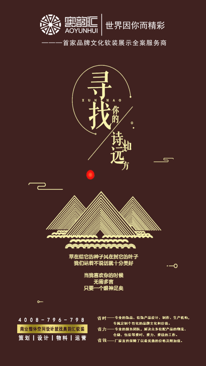 logo的字(zi)體部分,“奧韻匯”字(zi)體采(cai)用了(le)中國(guo)式風(feng)格(ge)結構的變體字(zi),意在符合奧(ao)韻匯(hui)的中國式設計(ji)文化理(li)念;而奧(ao)韻匯(hui)諧音于“奧(ao)運會(hui)”,旨(zhi)在奧(ao)韻匯(hui)在發揚(yang)中(zhong)國式(shi)文(wen)化設計的同時企業(ye)愿景:打造全球最大的家(jia)居運營和服務商。