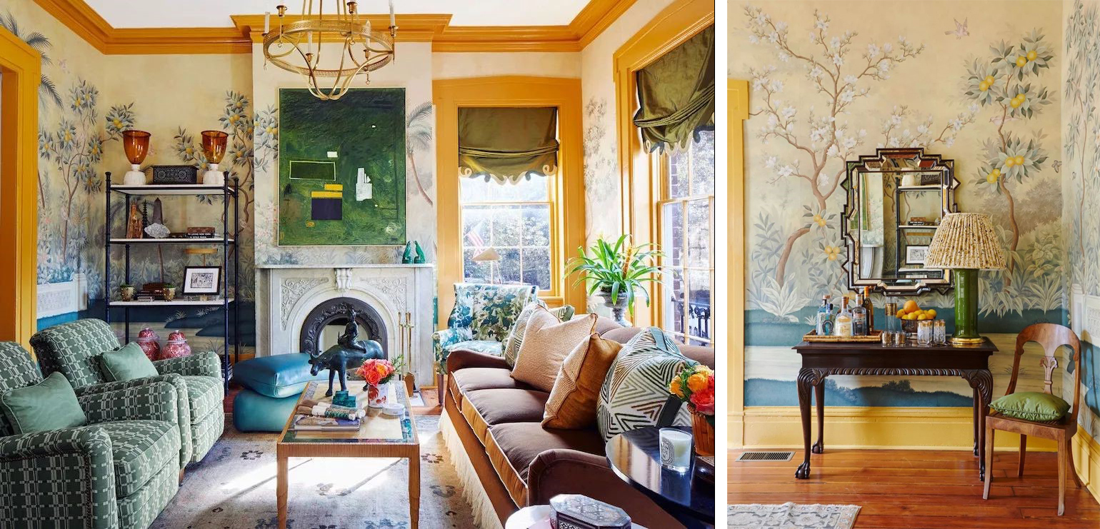 ——黃色調的中國(guo)風(feng)壁(bi)紙,尤為(wei)的雍容華貴,金色邊角將壁(bi)紙基調提升,樹梢綠協(xie)調黃色轉變空間的氣質。