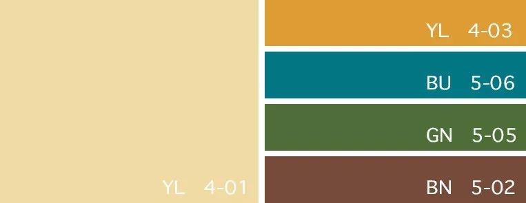——淺(qian)松石、灰綠(lv)色(se)、淺(qian)孔雀藍、冰川(chuan)灰、奶(nai)黃(huang)色(se)——