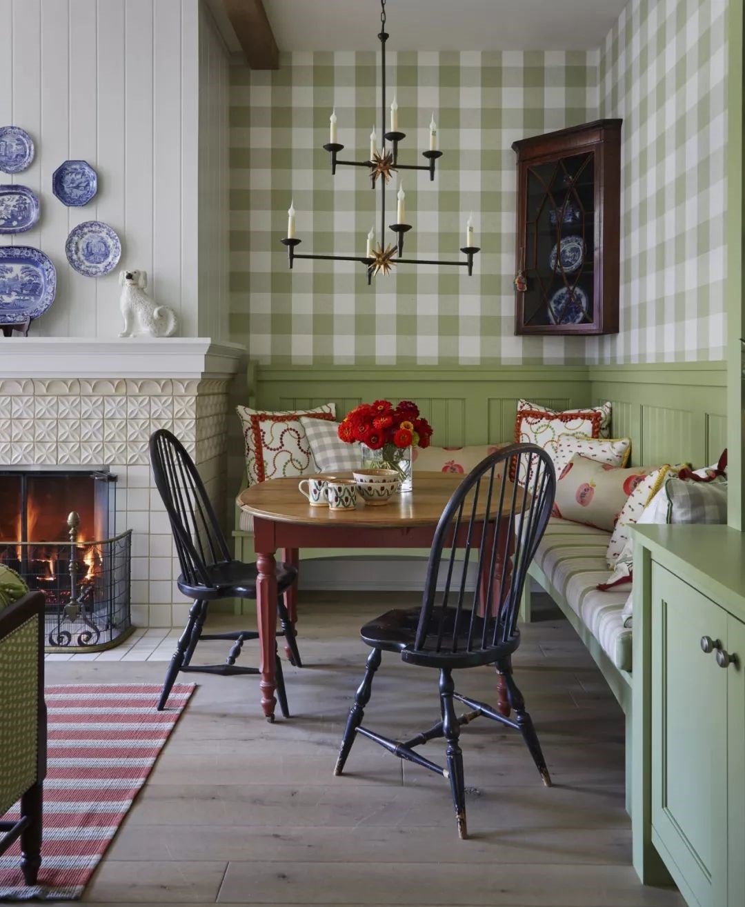 這間(jian)別致的(de)(de)(de)農舍早(zao)餐(can)室也(ye)許會讓人想起(qi)19世(shi)紀的(de)(de)(de)英國電影(ying)里(li)的(de)(de)(de)場景。綠色(se)方格花紋布藝(yi)壁紙就(jiu)像那些經久不衰的(de)(de)(de)裝飾元素,帶(dai)來田園的(de)(de)(de)純樸與溫(wen)暖感(gan)(gan)覺。漆成黑色(se)的(de)(de)(de)木(mu)質餐(can)椅與鐵質老(lao)式燭(zhu)燈一起(qi),復刻(ke)出那個年代(dai)的(de)(de)(de)質樸和浪漫。紅色(se)的(de)(de)(de)花邊抱枕和條紋地毯雖(sui)然色(se)彩鮮艷,但也(ye)不事張揚,反(fan)而泛(fan)著濃(nong)濃(nong)的(de)(de)(de)年代(dai)感(gan)(gan),壁爐上的(de)(de)(de)青花瓷器是對藝(yi)術感(gan)(gan)的(de)(de)(de)一種補充(chong)。