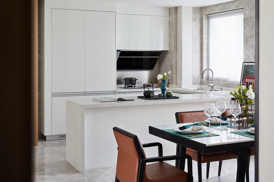 廚(chu)房吧臺以茶為主題(ti),借由裝(zhuang)飾品成為大面積純白場(chang)景內精妙的(de)點綴。