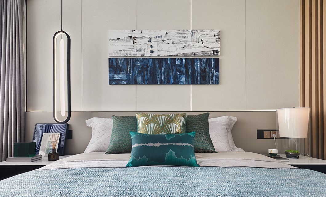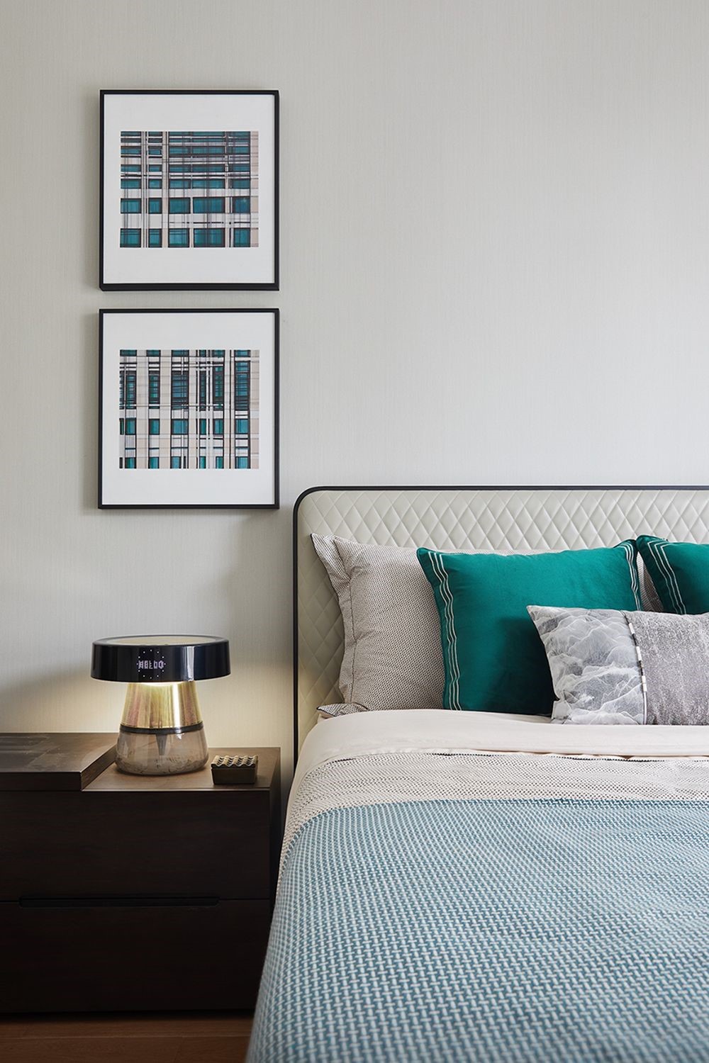 長輩房以淺灰色壁布鋪陳,墻(qiang)面(mian)借用非(fei)常規的(de)側面(mian)裝(zhuang)飾畫營造(zao)現代氛圍,以柔和亮色作映襯,渲染一種(zhong)親(qin)和淳樸(pu)、安享自(zi)身的(de)人生態度。