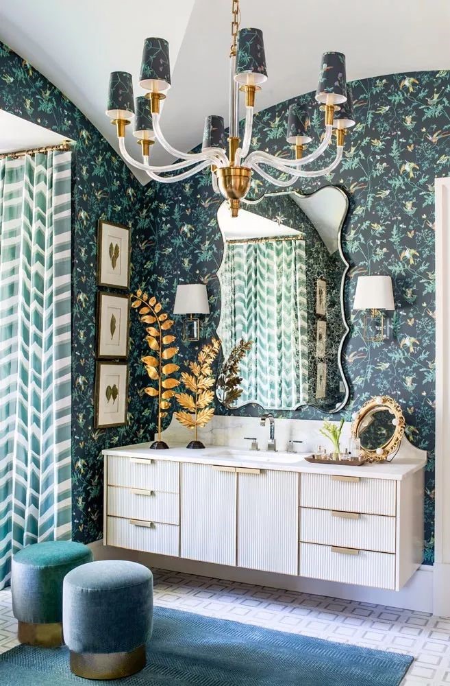 ——設計師被櫥柜蘆葦狀裝飾和黃銅框架吸引,他選擇了上七十年代的蜂鳥壁紙,將空間演變成法國花園主題。墻紙上出現枝形吊燈裝飾,絲形的帷幔為有機的而富有戲劇性的浴室畫上了框架。設計師索西說:“雖然他是老式的,但我們仍然為那些作品帶來了非常現代的尺度。”