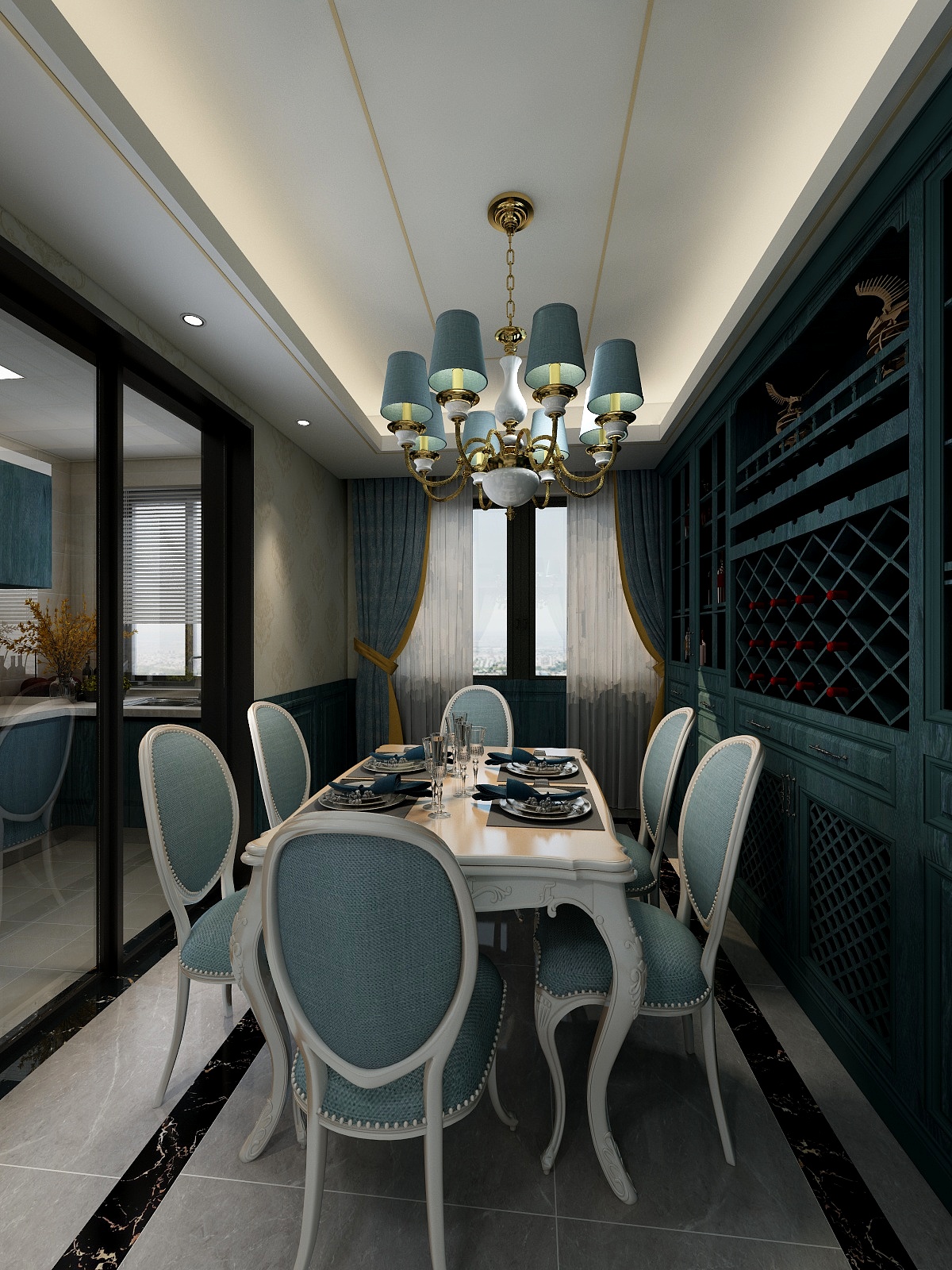 客餐廳采用歐式家具,采用與傳統的歐式不同的淺藍色家具,別有一番清新綺麗的風格。