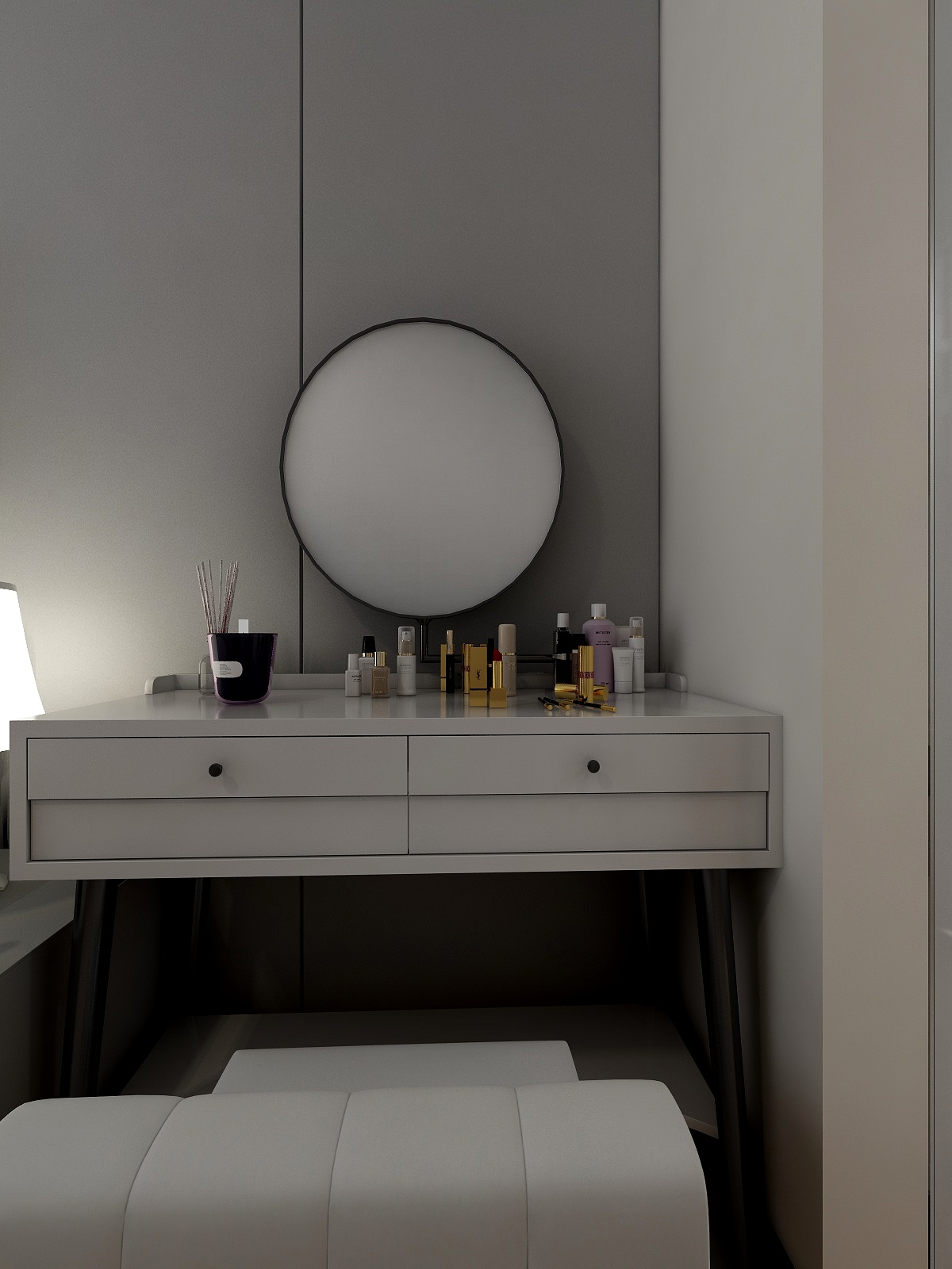 ——臥室講究溫暖舒適,使用了大量的米白色,烘托溫暖的氛圍。梳妝臺方圓結合,現代與時尚感呼之欲出。