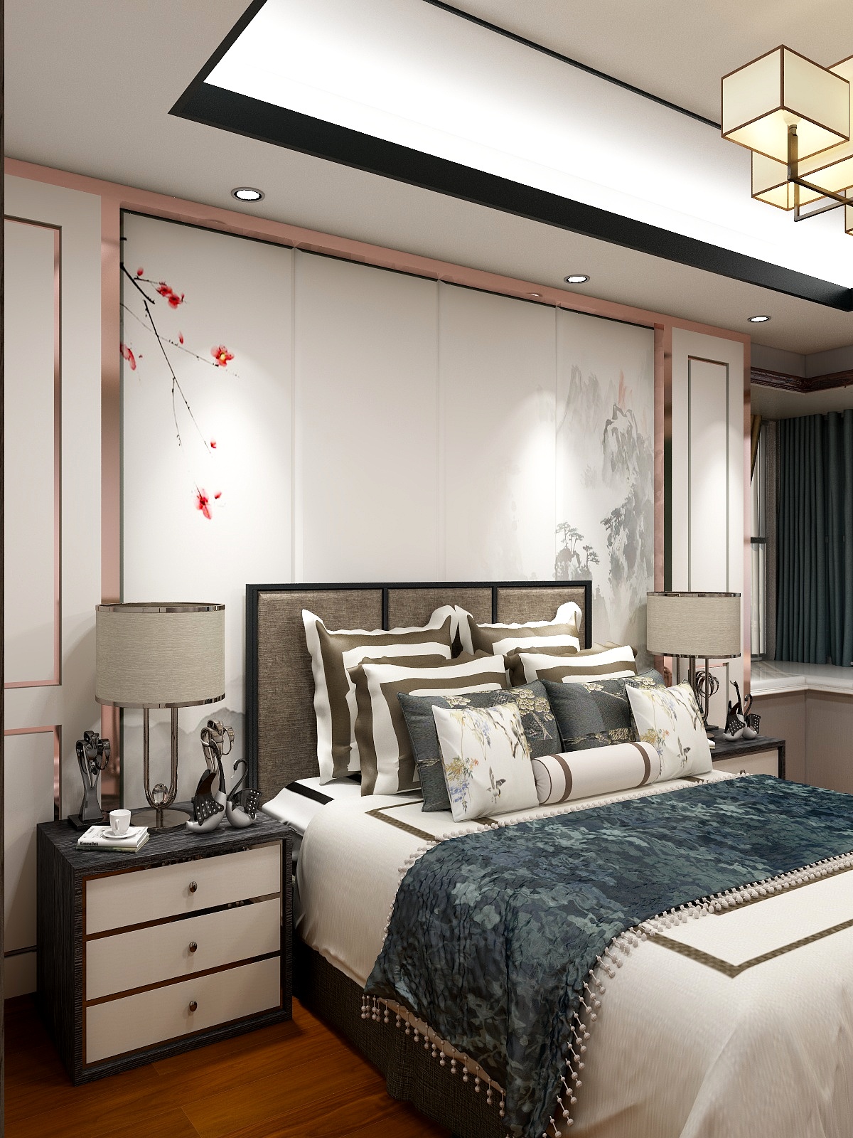 ——本案為(wei)新(xin)中式,不同于中式的(de)裝(zhuang)修風格,它更為(wei)簡潔(jie),線條感清晰,顏色相對來說(shuo)較為(wei)低(di)調(diao)(diao)。客廳簡潔(jie)協(xie)調(diao)(diao),新(xin)中式山水畫的(de)裝(zhuang)點,韻味更濃,玫瑰金描(miao)邊,低(di)奢浪(lang)漫。