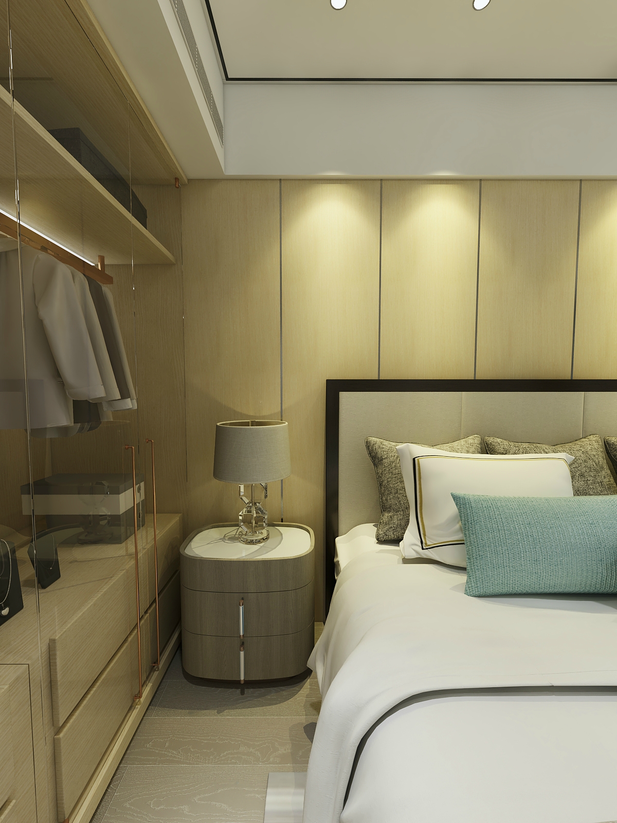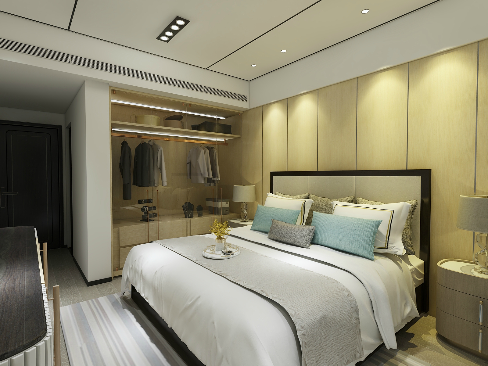 ——本(ben)案(an)中的(de)臥室,多采用線條進行勾勒,與暖色護墻板搭配,暖色的(de)的(de)氛圍燈,使人倍感溫暖。