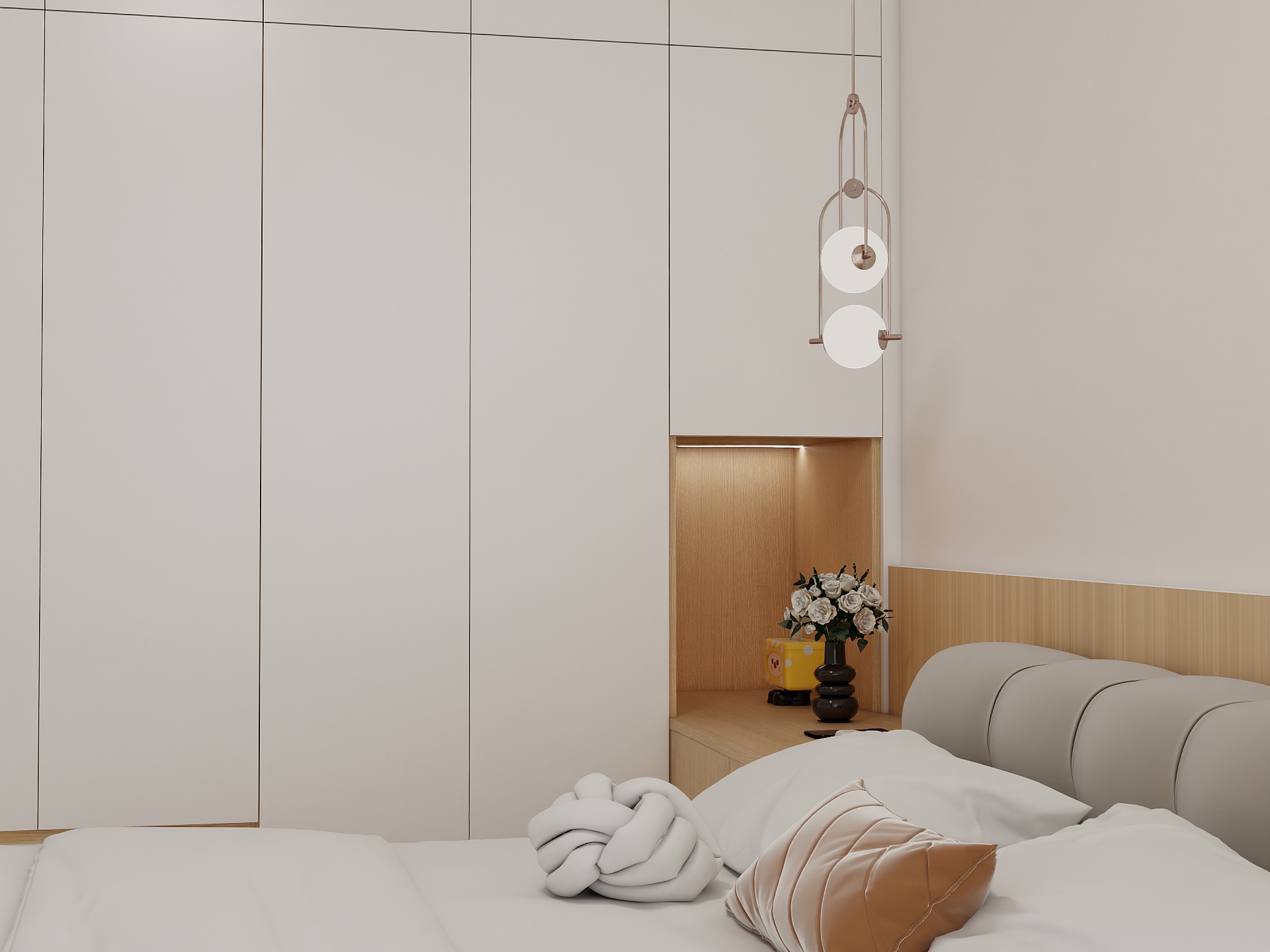 白色與原木色的(de)搭配(pei)營造出了寧靜(jing)舒(shu)適的(de)睡(shui)眠(mian)環境。