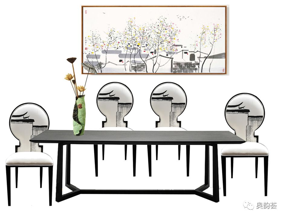 村外又村千戶蔭,樹間生樹四時春。餐廳用古風建筑為題,描繪了(le)一幅清(qing)雅脫俗的畫(hua)。奧韻匯全屋軟裝設計定制仿佛身(shen)臨其(qi)境。